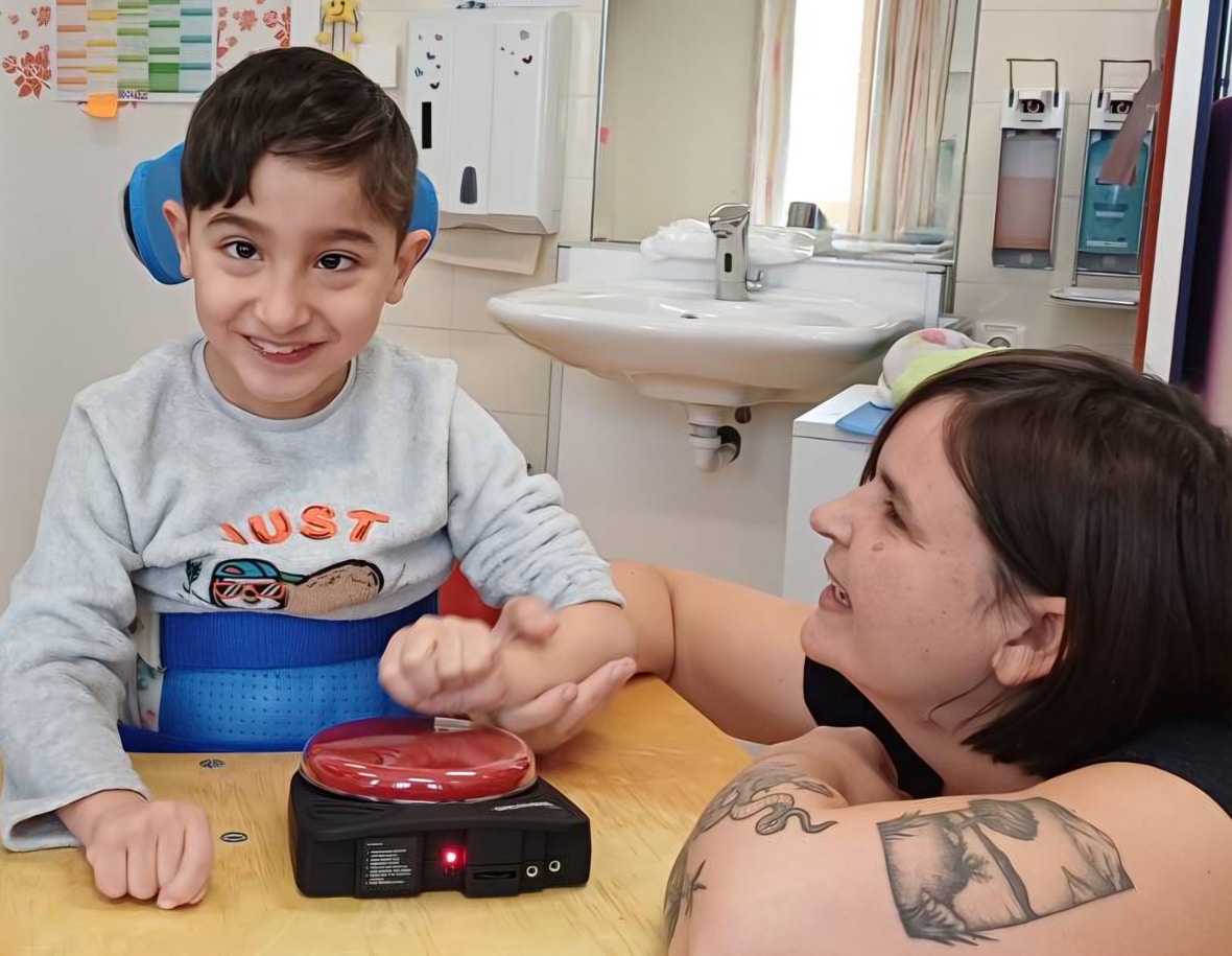 28 Schüler*innen eines Schulzentrums für Kinder mit Behinderungen freuen sich über spezielle Taster, die eine hilfreiche Unterstützung im Unterricht sind: Die Taster lösen einfache Handlungen aus und eignen sich für die Bedienung von adaptiertem Spielzeug, für Kommunikationshilfen sowie zur Umfeld- oder zur PC-Steuerung. Die Geräte geben Mitteilungen oder Geräusche wieder; nacheinander lassen sich damit kleine Geschichten, Geräusche, Witze oder Mitteilungen abspielen. So gelingt es, einfache Kommunikationssituationen zu meistern und die Selbstständigkeit zu fördern.